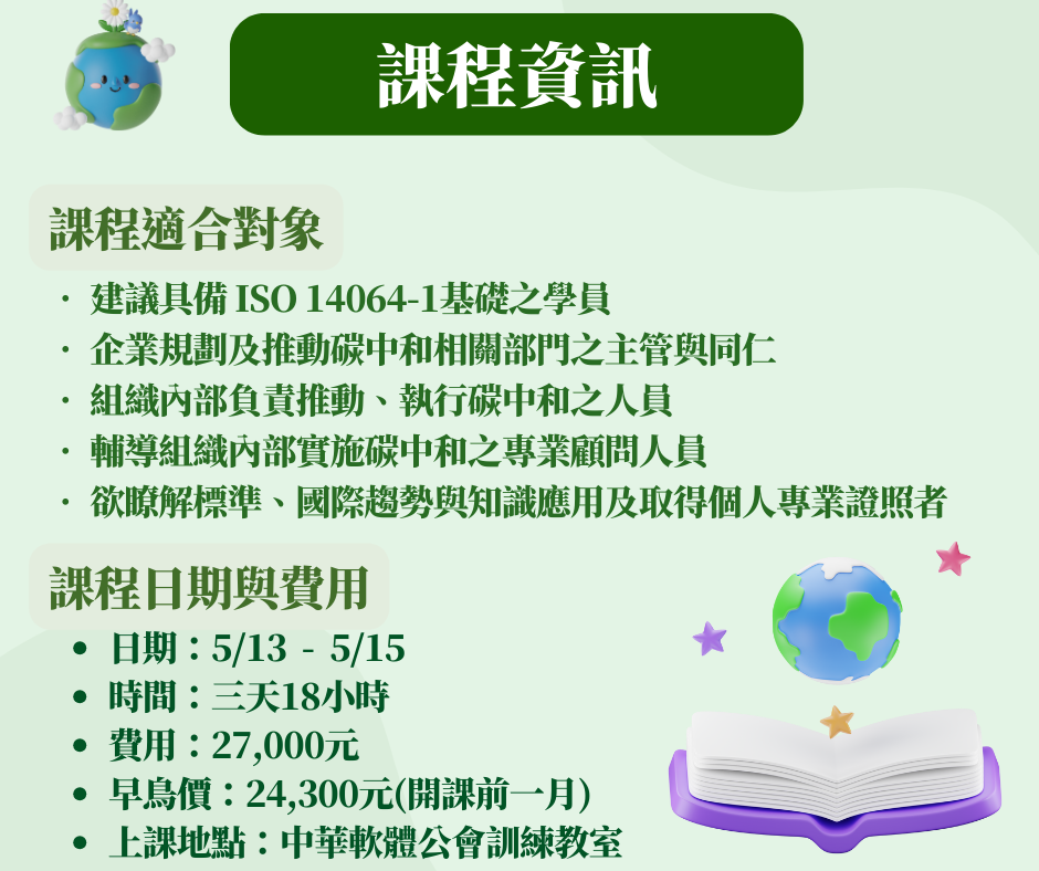 課程將讓學員瞭解 ISO 14068-1標準內容、查驗及導入實務。三天課程採階段性的從回顧 ISO 14064-1及ISO 14067(組織及產品)溫室氣體盤查標準精華並瞭解國際及國內碳中和、碳交易與碳抵換之發展趨勢並啟動學員進入ISO 14068-1